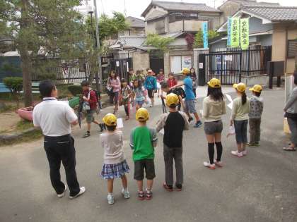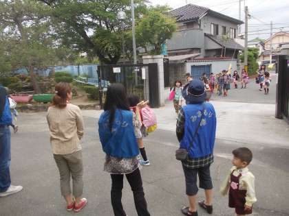 児童会役員が帽子をかぶりカードを手に持ち,登校してくる全校児童に挨拶を呼びかけました。PTA役員の皆様も一緒に活動してくださいました。