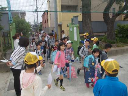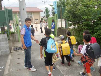 児童会役員が帽子をかぶりカードを手に持ち,登校してくる全校児童に挨拶を呼びかけました。PTA役員の皆様も一緒に活動してくださいました。