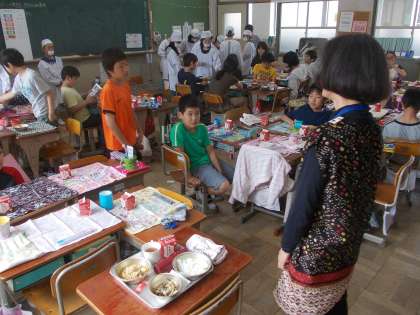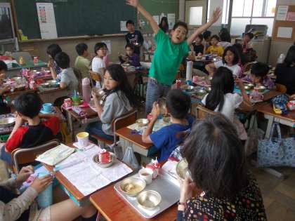 SC菊地先生が6年1組で和やかに給食を食べておられます。食事を共にすると,いろいろな話題が気軽にできるようになります。