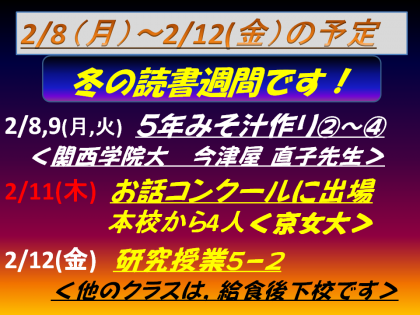 ○2/12(金)・・・校内で教職員全員による授業研究会があります。5年2組で行われる国語の授業を参観後,研究会を持ちます。このため,5年2組以外の子どもたちは,給食後には,下校となります。