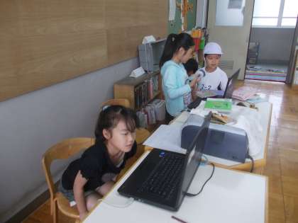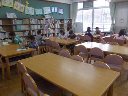 雨模様の朝休みの図書室の様子です。たくさんの子ども達で賑わっています。
