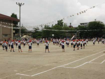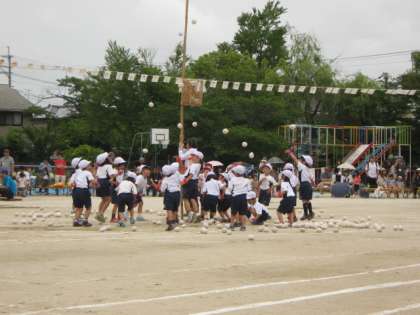 みんな釘づけ!メインの玉入れは赤組白組どちらも頑張って引き分けです。