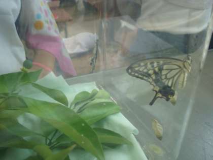さなぎからアゲハチョウが出てきました!クラスに残っていたほとんどがさなぎが成虫になる瞬間を見ることができました!!「すごーい!」「羽はまだ小さいな」と子どもたちも感動していました。
