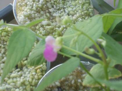コップの中で栄養のないパーライトを敷いてもらって発芽したインゲンマメ。理科室の窓際で欠かさず水やりをしたところ,花が咲きました。