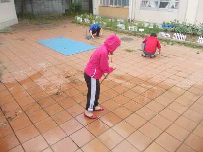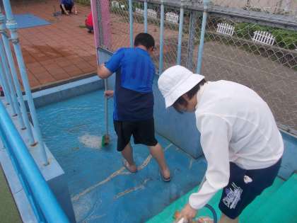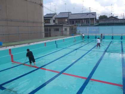 放課後に教職員で仕上げをしました。壁・床の汚れを集めたり,プールサイドやシャワーのところをきれいにしたり,マットやプールの外側もきれいにしました。