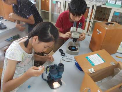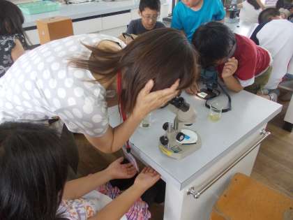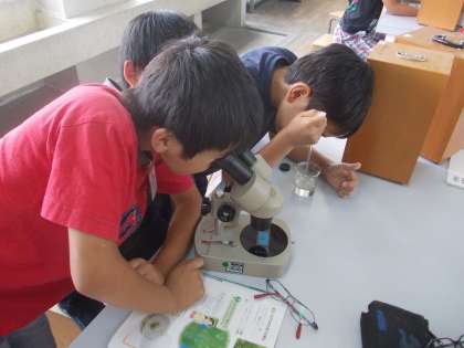 メダカのエサになる生物を見つける課題で,顕微鏡,双眼実体顕微鏡,解剖顕微鏡の使い方を知り,ミジンコなどの生き物を観察しました。
