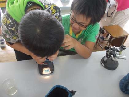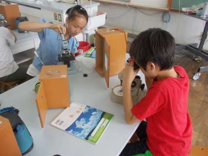 メダカのエサになる生物を見つける課題で,顕微鏡,双眼実体顕微鏡,解剖顕微鏡の使い方を知り,ミジンコなどの生き物を観察しました。