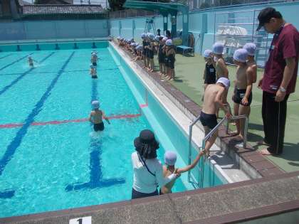 プールに入る時の約束を教えてもらい,水慣れをします。とてもよい天気で,気持ちよさそうでした。