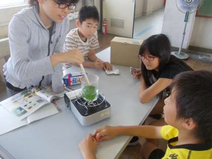 午後から後の2枚のでんぷんの有無を調べたところ,うす曇りだった時間帯があったせいか,全部の班でうまく結果が出ませんでしたが,アルミホイルを外して日光に当てた葉にはでんぷんができている様子を確認することができました。