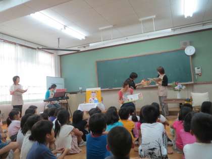 今日は学年室の特別舞台で,パレットさんに読み聞かせをしていただきました。音楽の流れる中「おかえし」のお話。おかえしのおかえしのおかえしの...楽しい時間をありがとうございました。続きはお家で聞いてくださいね。