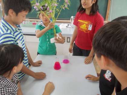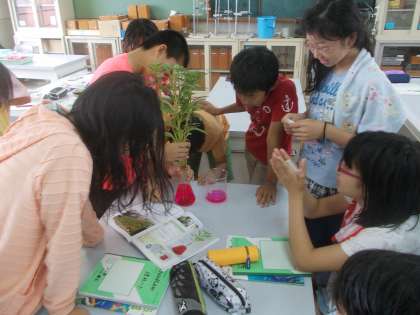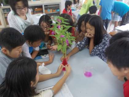 いつも植物をいじめて実験をしている高学年ですが,今度は吸水実験をしました。機嫌良く育ったホウセンカを色水につけて,水の通り道を調べます。