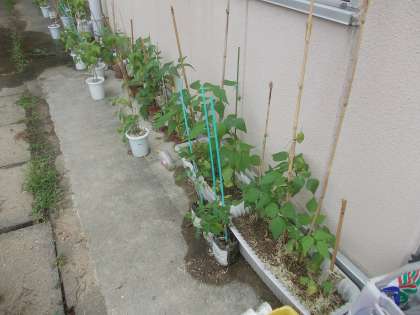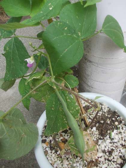 5年生が理科の学習で発芽・生育条件を調べるために紙コップに植えたインゲンマメを植木鉢に植えかえて育ててきました。うまく育ったものは,開花・結実しています。