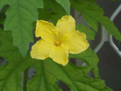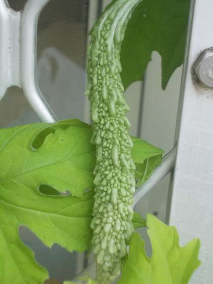 ツルレイシが育ち,花が咲き始めています。ほとんどが雄花なので,注意深く雌花を探したのですが見つかりませんでした。ところが,雌花の段階を通り越して実になっているものがありました。雌花の観察をするためには,毎日根気強く観察する必要がありそうです。