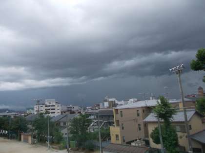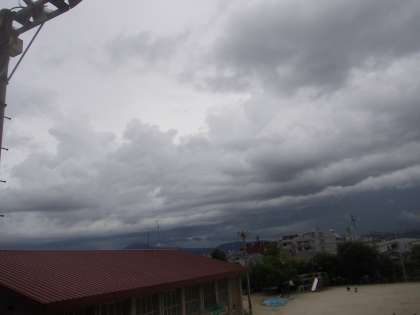 5年生の教室は運動場に面している3階なので,空の様子がとてもよくわかります。写真は,6時間目終了時の空の様子です。この時はまだ雨は降っていませんでしたが,直後に雨が降り出しました。5年生の理科の始めの単元で『雲と天気』を勉強した5年生は,口々に「絶対雨が降る…」「黒い雲や」と話していました。テレビ等の天気予報をチェックすることも大切ですが,梅雨時や台風接近時の豪雨は極地的になるので,実際の空を見て天候を調べる習慣も身につけてほしいものです。