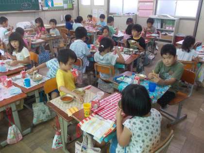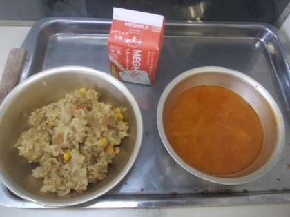 台風接近により,休校の可能性・物資供給が滞る可能性がありましたので,プリントでお知らせした通り献立を変更しました。写真は2年生の教室のものです。2年生なりに,献立変更の必要性を納得してくれました。普段より早く食べ終わる子どもが多いように感じました。