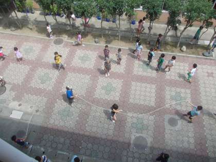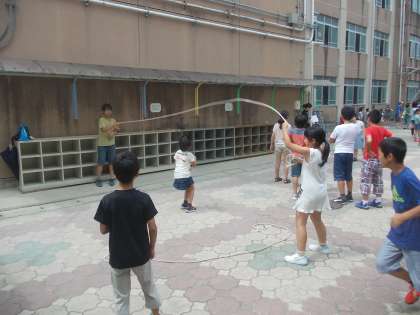 桂校のなかよしタイムは,中間休みに縦割りグループで,中庭・担当の先生の教室・運動場・体育館で遊ぶというものです。6年生のリーダーさんが場所や遊びの調整をして,準備もしてくれました。低学年の児童を迎えに行くのも高学年の仕事でした。
