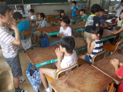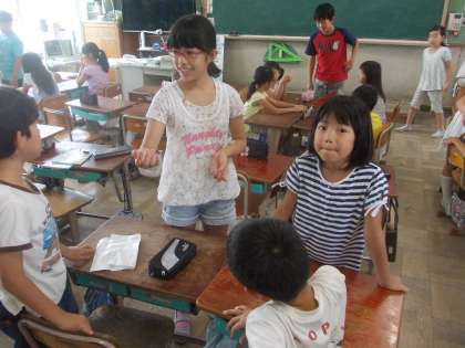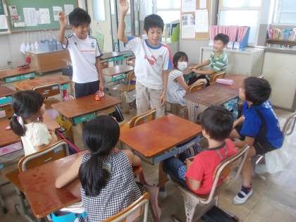 桂校のなかよしタイムは,中間休みに縦割りグループで,中庭・担当の先生の教室・運動場・体育館で遊ぶというものです。6年生のリーダーさんが場所や遊びの調整をして,準備もしてくれました。低学年の児童を迎えに行くのも高学年の仕事でした。
