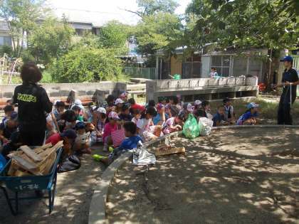 8月20日は4年生の登校日でした。久し振りに日焼けした仲間が集まりました。机と椅子を教室に戻して挨拶をすませたら,早速野外かまどに向かいました。
