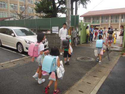明け方の豪雨がやみ,夏休み明け登校初日は傘をささずに登校できました。見守り隊の登校指導に加え,ニコニコの日・PTA見守りとたくさんの出迎えの中,授業再開ができました。いつもありがとうございます。