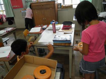 長さの勉強で、初めて巻尺を使いました。教室の縦と横や、黒板の長さなど、二人組で協力して測りました。中には友達の身長を測る子もいておもしろかったです。「うわ〜教室は7メートルもある」と驚いていました。でも巻尺のひもをまっすぐピンと伸ばすのはなかなか難しく、みんな苦労していました。