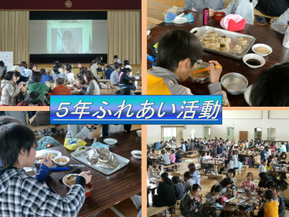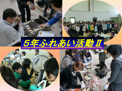 今日の午後,体育館では5年生のふれあい活動がありました。”大豆パワー”の仕上げで”豚汁”と保護者のみなさんが丁寧に焼き上げたおもちをいただきながら,楽しく会食をしました。各人のビデオを流しながら最後に歌と演奏を披露した。