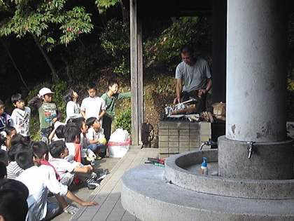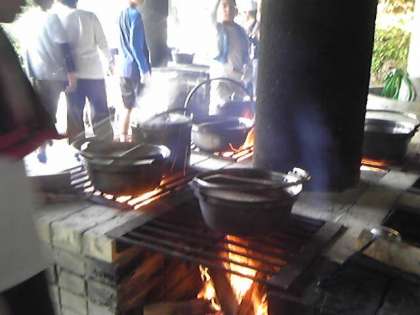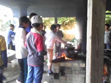 ・野外炊事場で火のおこし方を教わり,カレーライスを作ります。おいしく出来るかな!