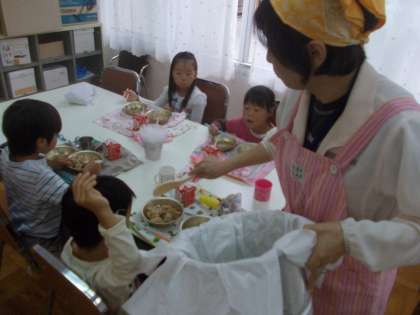 ランチルームでは,1年1組が岩元栄養教諭から,変更された献立について教えてもらって合掌をして給食を食べました。特配のおかわりは,齋藤先生に配ってもらいました。ランチルームで台風献立の給食を食べたことは,思い出に残るような気がします。