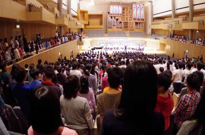 開会の挨拶の後,全参加者が京都市歌を歌いました。参加校の演奏を聞くうちに緊張が高まり,次第に出番が近づいてきました。