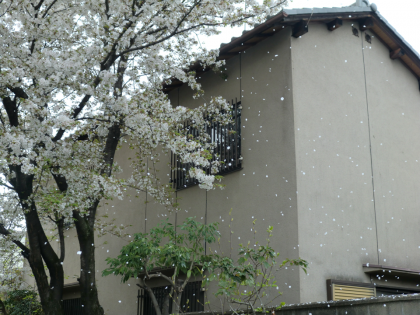 先週には満開を迎えた桜も盛んに散り始めました。本校給食室前の桜は,わずかな風にも反応して散っていました。ときには強い風に雪吹雪のような様を見せてくれていました。