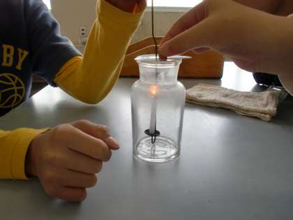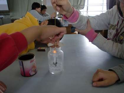 「ものが燃えるには、新しい空気が必要である」ことを確かめる実験をしました。炎の様子をしっかり観察していました。