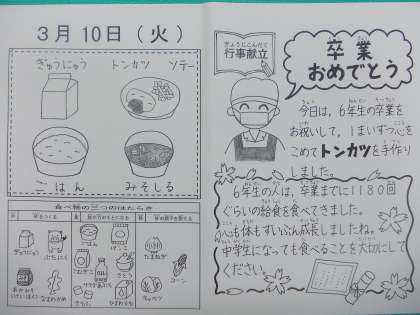 残菜をなくして完食してほしい…という願いのパクパクの日も,今年度最終回を迎えました。おりしも今日の献立は『卒業祝い』でした。もちろん,全校ほぼ完食でした。