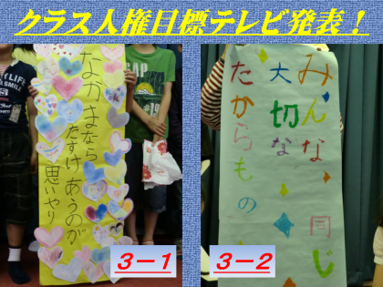 各クラスでは,それぞれ人権目標を決めて自分も人も大切に出来るクラスづくりをしています。今日の昼のテレビ放送で,中学年とたいよう学級の人権目標の発表がありました。