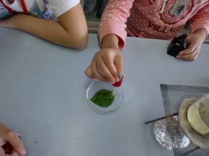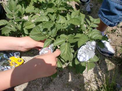じゃがいもの葉に日光が当たるとでんぷんができるのかどうか条件を整えて実験しました。昨日からアルミニウムはくを葉にかぶせて「日光あり」と「日光なし」を準備しておき、今日「ヨウ素でんぷん反応」を使って調べました。