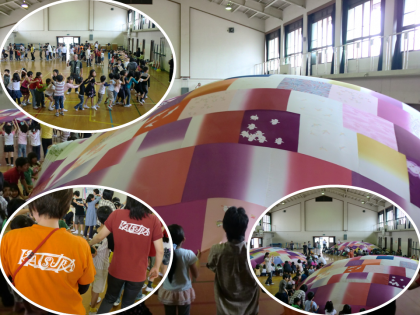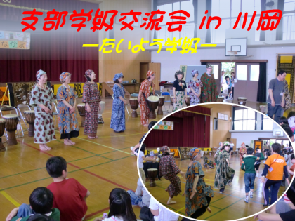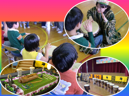 今日午前に川岡小で支部育成学級の交流会がありました。今日は,アフリカの民族衣装に身を包んだ人たちによるアフリカ音楽を太鼓や様々な楽器を使って奏で,ともに踊って楽しみました。そのあと川岡小の3年生と一緒にバルーンで交流しました。