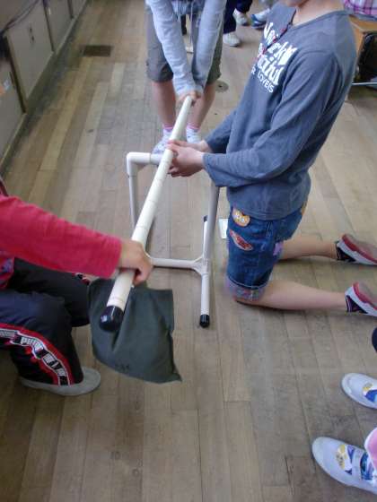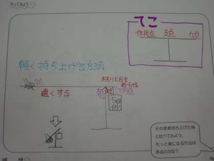 重いものを軽く持ち上げる方法を調べました。実験を通して力点・支点・作用点について知りました。今後、さらに詳しく調べていきます。