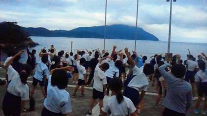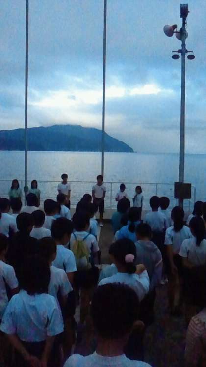 ・おはようございます。3日目の朝を迎えました。曇ってます。波は穏やかです。選択活動、カッター、キャンプファイアーをする予定です。盛りだくさんの一日の始まりです。