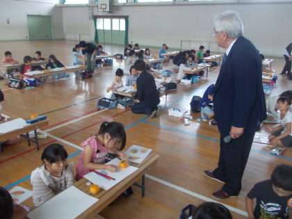 現在京都市美術館で開催中の第100回院展にも出展されている清水達三先生をお迎えして,3年生が柿を題材に絵の描き方を教えていただきました。形の取り方,色のつくり方,水の塩梅,筆での塗り方,3年生の子ども達にもよくわかるように丁寧に教えてくださいました。