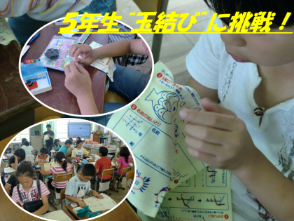今日の午後からの5年生の授業のひとコマです。家庭科の裁縫では,”玉結び”の学習です。慣れない手つきで一生懸命に挑戦していました。また隣りのクラスでは,図工学習で家からペットボトルやフタ,ストローなどを持ってきて,”ゲートを抜けてゴールイン”の製作に夢中でした。どちらも楽しい雰囲気が漂っていました。