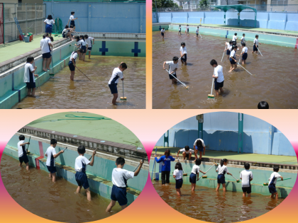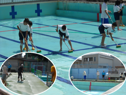 プール学習に先立って,昨日に5年生がプール清掃を頑張ってくれました。1年間使っていないために,プールの水はもちろんのこと,プールサイドや溝など汚れと共に丁寧にカビなども落としてくれました。放課後には,教職員で仕上げをしました。これでプール学習も万全です。