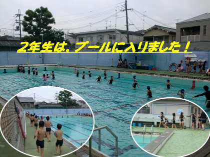 1年生は雨が降っていたのでプール学習を中止しましたが,中間休みの前になって雨が止み,時々晴れ間も見えましたので,3,4校時には2年生がプールに入りました。
