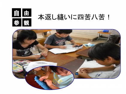 5年生が家庭科の学習で,長期宿泊学習に持っていく「ナップサッく」を作成しています。「糸通し」や「玉止め」,「並み縫い」や「本返し縫い」に四苦八苦です。みんな真剣な面持ちで作成に取り組んでいました。