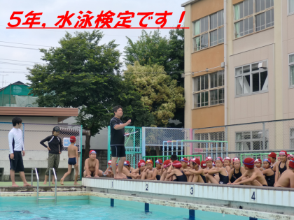 5年生は,今日のプールではどれくらい泳げるようになったかを測る検定の日です。今までの成果を発揮すべくみんな頑張っていました。