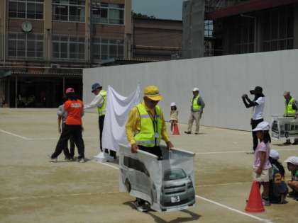 ・5月19日(木),3校時に運動場で1年生の交通安全教室を行いました。西京警察署と西京区役所,桂交通安全推進会の方々にお世話になり交通ルールや安全な歩き方を教えていただきました。