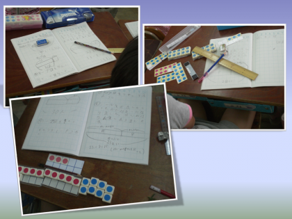 今まで使っていた数図ブロックを実際に並べてみて、それをテープ図にしてノートに書きます。初めてのテープ図に悪戦苦闘しながらも「こうやって書いたらいいんや!」と、集中して学習していました。