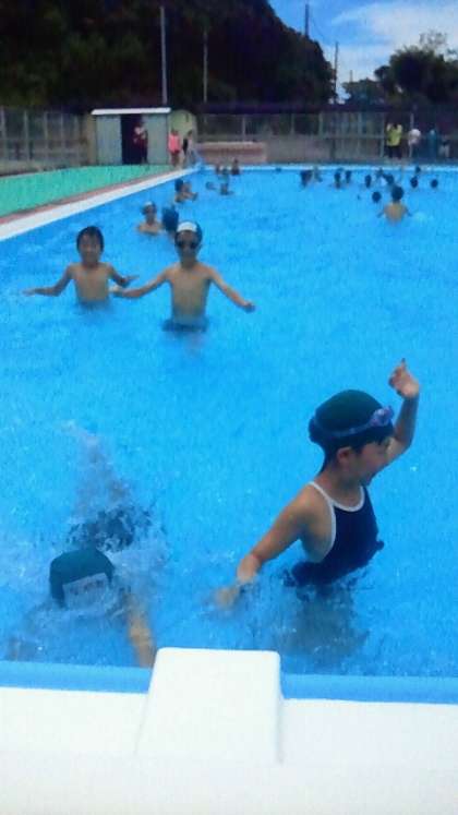 ・4年生は大野浜での砂の造形を終えて、みさきの家のプールで水泳学習を楽しみました。