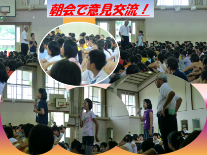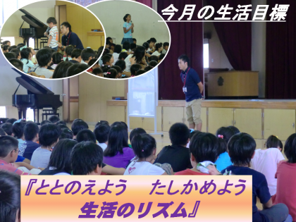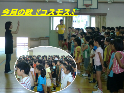 9月に入りました。今日は朝会です。最初に校長先生から図書室が多くの人たちの協力できれいになったこと,6年生が最後に頑張ってくれたこと,その作業を他の学年が見て感謝したことなどについて子どもたちと意見交流をいしました。その後,今月の歌『コスモス』を歌いました。今月の生活目標の発表です。『たしかめよう ととのえよう 生活のリズム』。この件についても子どもたちの意見発表がありました。