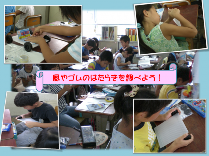 理科の時間に『風やゴムのはたらきをしらべよう』という学習をしています。今日は『風ver.』。
