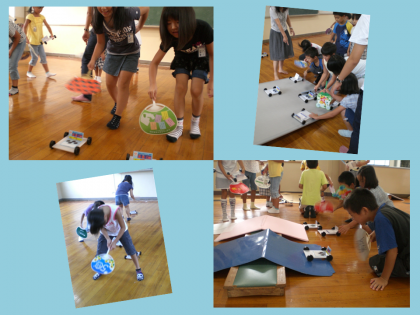 風で動く車をつくって、うちわなどで風を送って動かしました。どこからどんな風を送ったら、車がよく走るのかな?坂道はのぼれるかな??実際に実験しながら自分たちで確かめました。