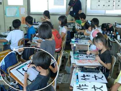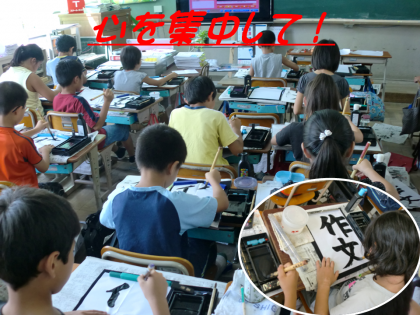 4年生は今日の2校時に習字がありました。お題は,「作文」です。大型テレビにもその字が見本として映し出されていました。子どもたちは,真剣に半紙に向かっていました。