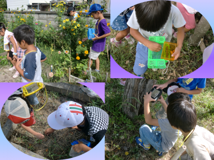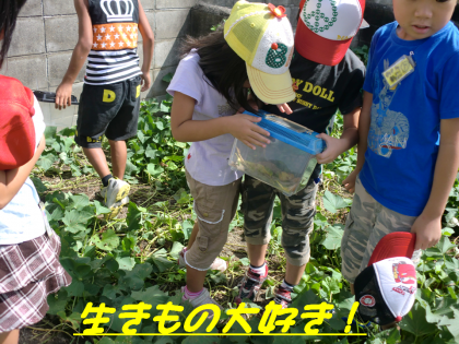 1年生は,生活科『生きもの大好き』の学習で校内の学級園などでバッタなどの虫を盛んに探して捕りました。子どもたちは,かごに入っている虫を自慢げに見せていました。